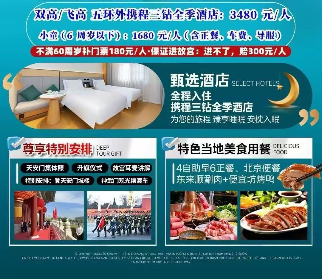 游覽景點:天安門廣場(游覽約1小時) 前往天安門廣場,傾聽祖國心臟的脈搏,目睹壯觀的“天安麗日”景觀,瞻仰毛主席遺容——【毛主席紀念堂】(每日限流如遇未預約到門票或者政策性閉館時,改觀外景),觀雄偉的【人民英雄紀念碑】,外觀【人民大會堂】,游覽景點:天安門城樓(游覽約1小時如未預約成功改為景山公園) 遙想新中國的建立、抗戰勝利80周年閱兵場景。 游覽景點:故宮博物院(放慢腳步,留足3小時), 故宮是中國明清兩代的皇家宮殿,舊稱紫禁城。這里曾居住過24個皇帝,是世界上現存規模最大、保存最為完整的木質結構古建筑之一。走近全新開放的《還珠格格》皇太后居住的慈寧宮、《甄嬛傳》熹妃娘娘居住的壽康宮,感受皇家萬千氣象。 游覽景點:天壇公園(含小門票)(游覽約1小時) 天壇是明清兩代皇帝祭祀天地之神和祈禱五谷豐收的地方。被認為是現存的一組最精致,最美麗的古建筑群。天壇以嚴謹的建筑布局、奇特的建筑構造和瑰麗的建筑裝飾著稱于世。 溫馨提示: 1、故宮每日限流3萬人,門票常年緊張,若您近期打算出游,請盡早下單,以免門票售罄無法參觀。 2、故宮門票提前7天晚上8點開售,我們將在第一時間為您預約購票,盡量搶票。 若實在無法搶到故宮門票,最 晚提前一天通知您:【全額退還故宮門票,免費贈送:景山公園,登高俯瞰故宮全貌】。如您介意,請報名時與接待人員說明清楚。行程游覽順序可能會根據故宮門票搶到的日期進行調整,請您理解。 3、故宮游覽時間較長,本日午餐時間較晚,建議自備一些點心和零食充饑。 |