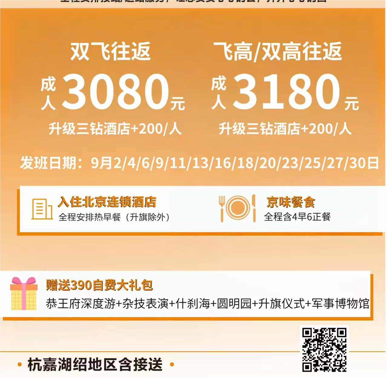 游覽景點:頤和園(游覽約3小時) 我國現存規模最大、保護最完整的博物館式皇家園林。晚清時期作為慈禧太后的頤養之地。頤和園是利用昆明湖、萬壽山為基址,以杭州西湖風景為藍本,汲取江南園林的某些設計手法和意境而建成的一座大型天然山水園。車覽高等學府【清華大學或北京大學】外景。 游覽景點:天壇公園 游覽明清兩朝歷代皇帝祭天之地【天壇公園】是世界文化遺產,明清兩代二十四位帝王舉行登基大典及祭祀天神的專用祭壇,也是世界上現存規模最大,最完美的古代祭天建筑群。(首道門票,不少于1小時)。 游覽景點:前門大街 安排有600年歷史的“天街”【前門大街】(不少于1.5小時)看看北京的老字號、逛逛北京的大柵欄,嘗嘗鮮魚口的北京小吃 游覽景點:軍博(或其他博物館,具體以約票為準) 乘車前往【軍事博物館】 中國人民革命軍事博物館是中國唯一的大型綜合性軍事歷史博物館,軍博收藏34萬多件文物和藏品。其中國家一級文物1793件,大型武器裝備250余件,藝術品1600余件,對外軍事交往中受贈禮品2551件。其中有銅鎏金弩機、鎮遠艦鐵錨、葉挺指揮刀、三八式步槍和解放軍第一輛坦克等重大歷史價值文物 晚餐后入住酒店休息。