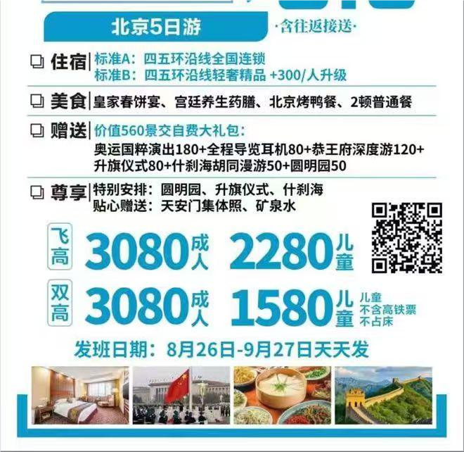 早餐打包,前往天安門廣場觀看大國禮儀神圣典禮【升國旗儀式】(如預約不上升旗則改為降旗,旅行社不承擔任何責任),游覽【毛主席紀念堂】瞻仰毛主席儀容(若遇政府關閉或限制團隊流量預約不上則改為參觀外景,旅行社不負任何責任),游世界現存最大的古代宮殿建筑群【故宮博物院深度游】(首道門票,不少于2小時),身處紅墻黃瓦,金碧輝煌的殿宇樓臺中,穿越時光年輪追溯那鼎盛的康乾盛世,眼前浮現歷史的滾滾煙幕。 中餐安排特色【北京京味菜】特別安排品嘗北京烤鴨體驗老北京的美食;后參觀【什剎海胡同漫游】(不少于45分鐘。)什剎海指前海、后海、西海三個湖泊及鄰近地區,這里擁有大片優美的湖面,也是北京著名的一片歷史街區,眾多名人故居,王府等古跡散落其中,還有貼近老百姓生活的各種美食,后海酒吧街更是京城夜生活的老牌勝地。 游覽明清兩朝歷代皇帝祭天之地【天壇公園】是世界文化遺產,明清兩代二十四位帝王舉行登基大典及祭祀天神的專用祭壇,也是世界上現存規模最大,最完美的古代祭天建筑群。(首道門票,不少于1小時),后觀北京【國粹表演】——京城第一秀(與海內外上千名游客共同欣賞為北京奧運特創編排,節目精彩絕倫,觀看1小時);晚餐后入住酒店休息; ☆溫馨提示:1、當天行程景點位于北京古老中軸線上,全天以步行為主。加之此中心區域為國家重要職能部門所在地,交通管制嚴格明確,單行道內不可隨意停車。故在此區域候車時間較長,步行路程較多,敬請提前做好心理準備,謝謝配合及理解。